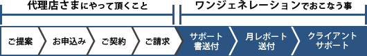 各会社さまへのサポートはワンジェネレーションがおこないます。ワンジェネレーションはSEO対策を施行する会社さまの件数数によって金額を代理店さまにご請求させて頂きます。
